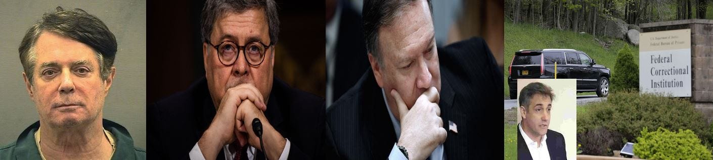 | l to r: Manafort, Barr, Pompeo, Cohen — Courtesy Bloomberg, Washington Post, nu.nl, NY Daily News/CNN |